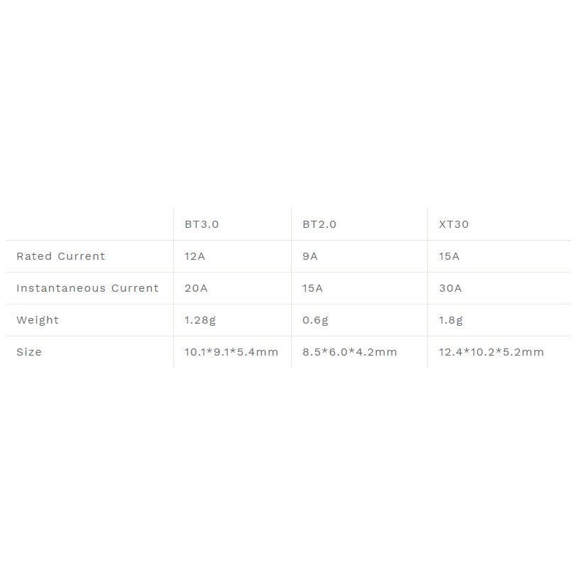 - The BT3.0 connectors boast a rated discharge current of 12A and an instantaneous current of up to 20A, meeting the discharge requirements of 2S batteries.