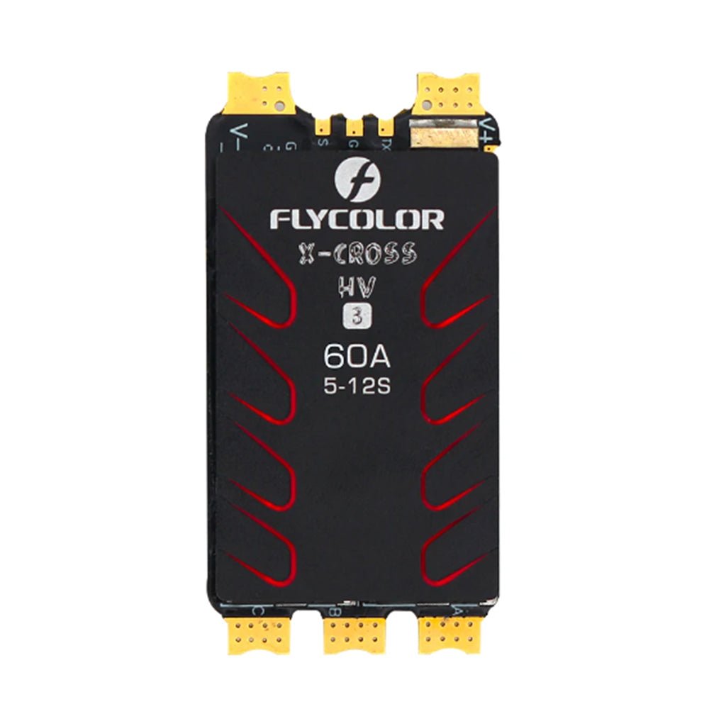 Flycolor X-Cross HV3 5-12S ESC is equipped with quality MOSFETs, BLHeli_32 firmware, an ARM 32-bit Cortex MCU, Telemetry, and more!