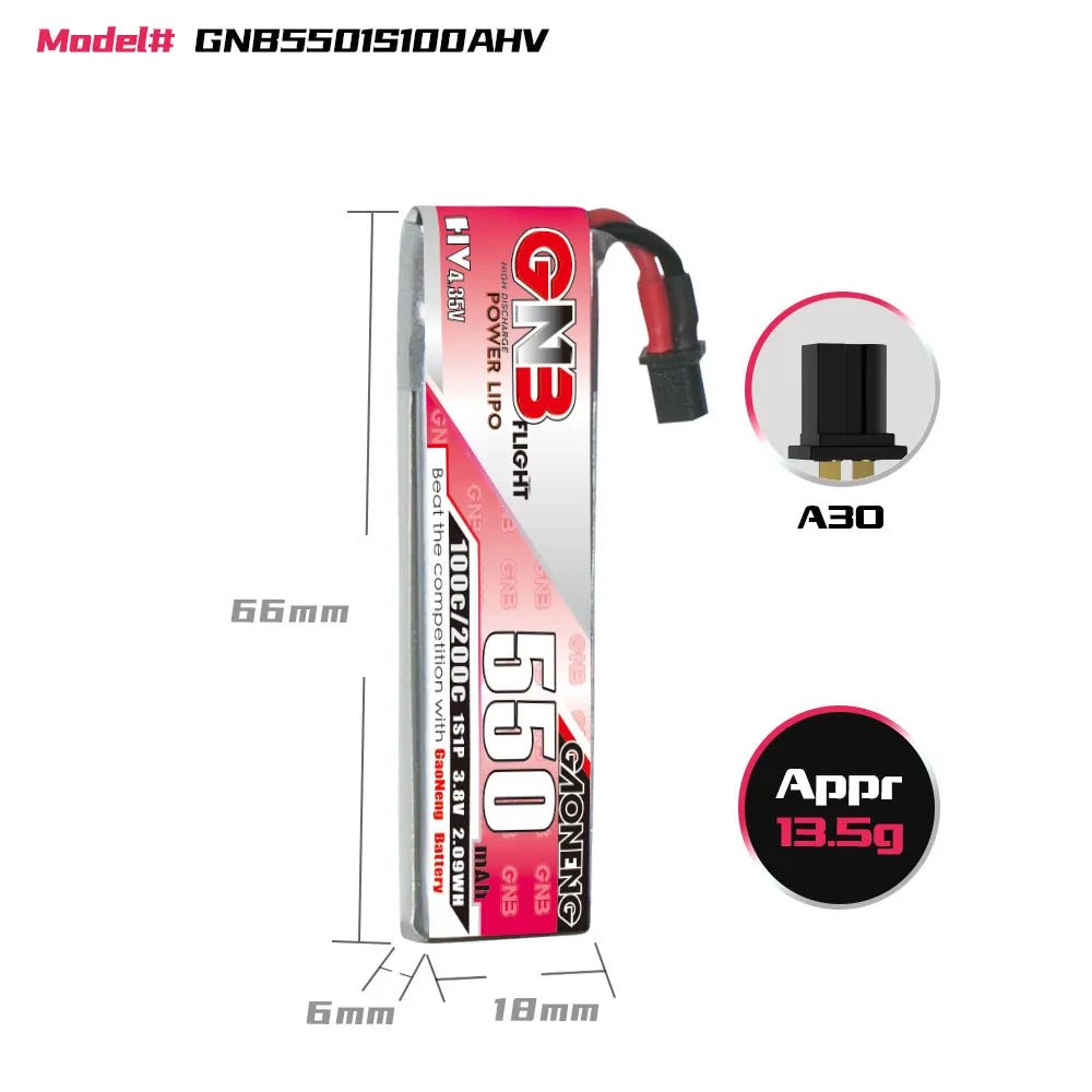 • 1 x Gaoneng GNB 1S 550MAH 100C 3.8V HV Li-Po Battery for Whoop Micro – A30 Cabled