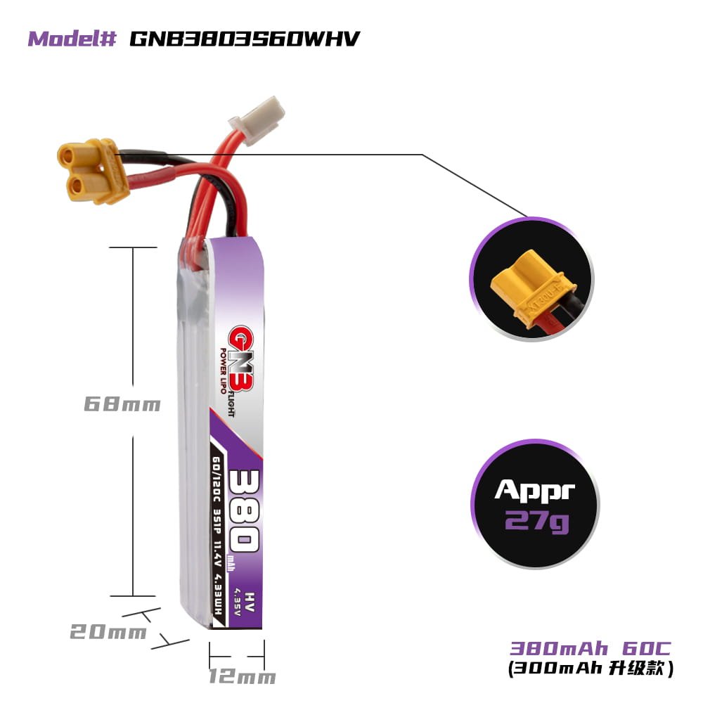 Gaoneng GNB 3S 380Mah 11.4V HV 60C Li-po Battery – XT30