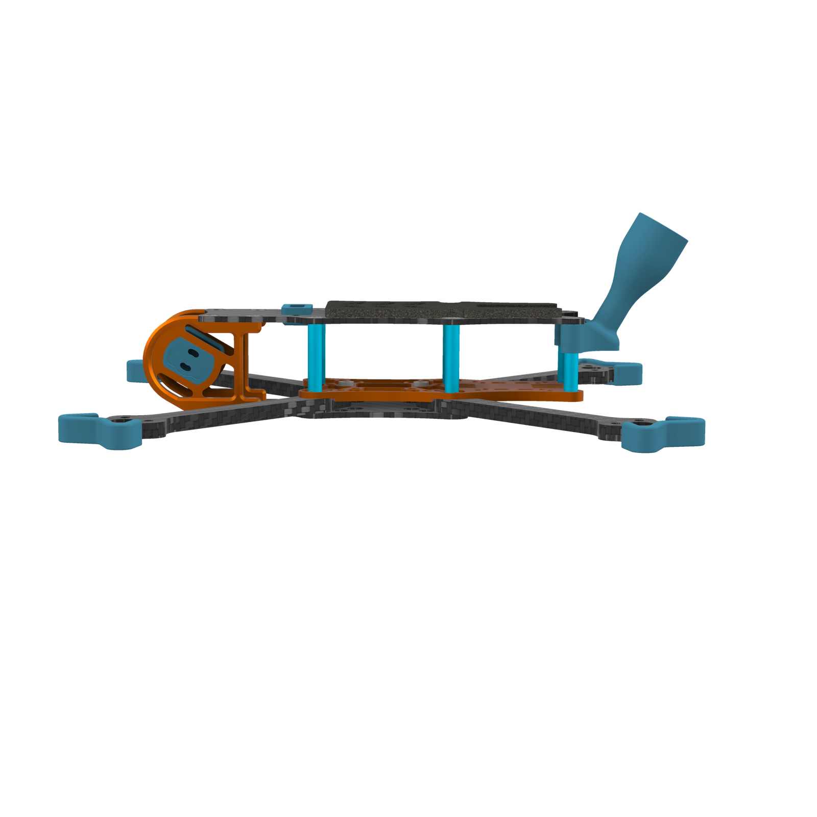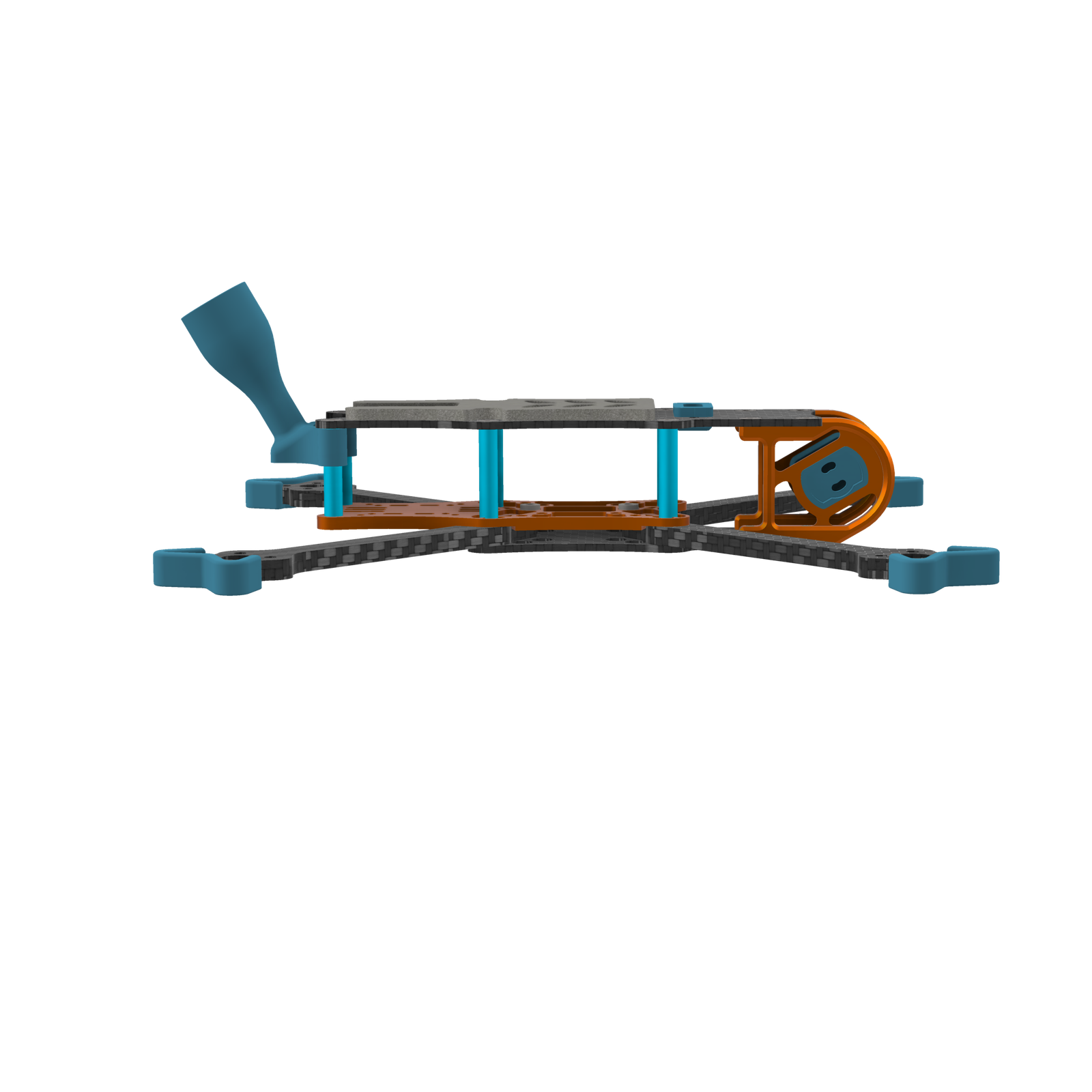 As with other popular Hyperlite models, this frame centers around a CNC machined aluminum plate; however, as an added bonus it serves more than the standard purpose of providing rigidness to the frame. In this case, the plate was specifically designed for use with the DJI O3 VTX (which is known to run hot), using integrated cooling fins to keep the temps down! Runcam Link or Analog VTX’s will benefit from the same feature, of course.