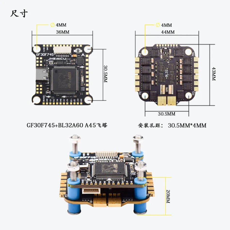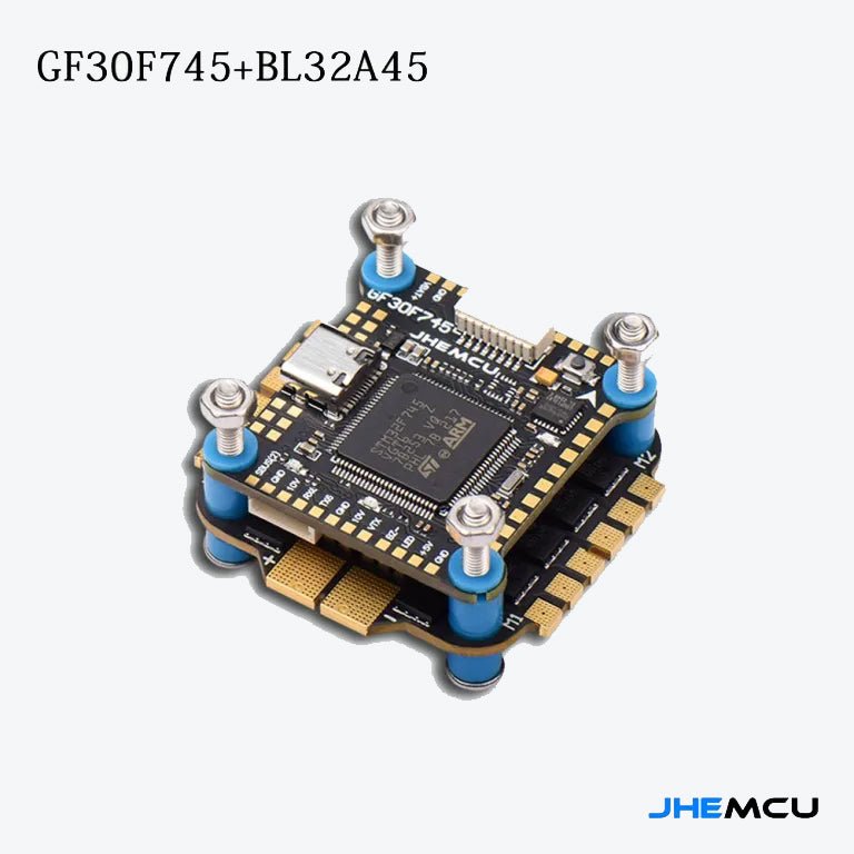 The JHEMCU GF30F745-MPU Flight Controller, combined with the BL32 45A 3-6S 4in1 ESC is a compact 30x30mm package providing reliable, high-performance Stack.