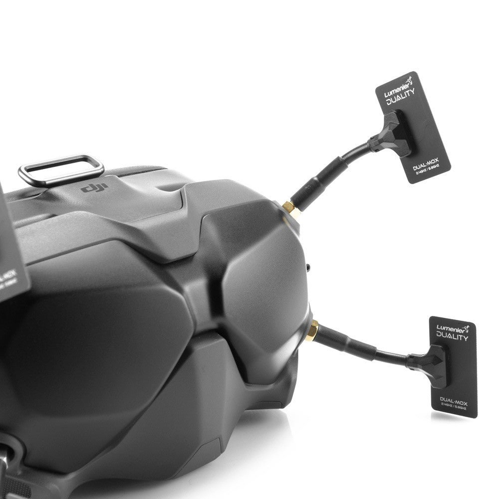 The Lumenier Duality DUAL-MOX HD Antenna was created in partnership with world-renown antenna designer Hugo of TrueRC to bring you this Dual-Band aftermarket antenna designed as a direct replacement and upgrade for your stock DJI antennas found on the DJI FPV Goggles V2. The Duality antenna was made from the ground up to be a perfect match for the DJI goggles. Duality antennas are form-fitting, low profile, color matching, direct connect RP-SMA, and all this with improved performance.