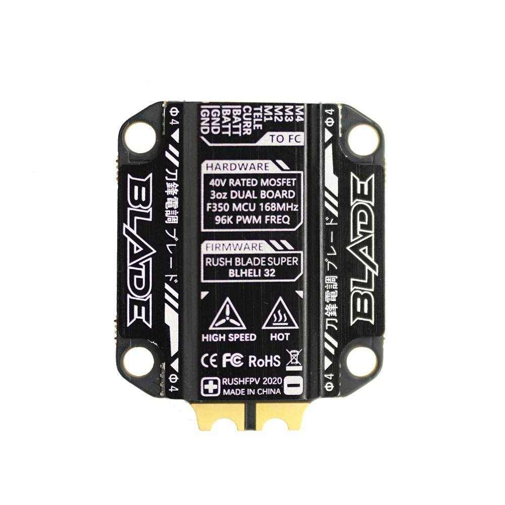The Rush Blade 50A 3-6S BLHeli_32 4-in-1 ESC Super Edition by RUSHFPV features, front & back special process aluminum shell, F350 MCU 168MHz with BLHeli_32 Firmware, 96K PWM FREQ. 3oz dual board and 40V rated MOSFET.